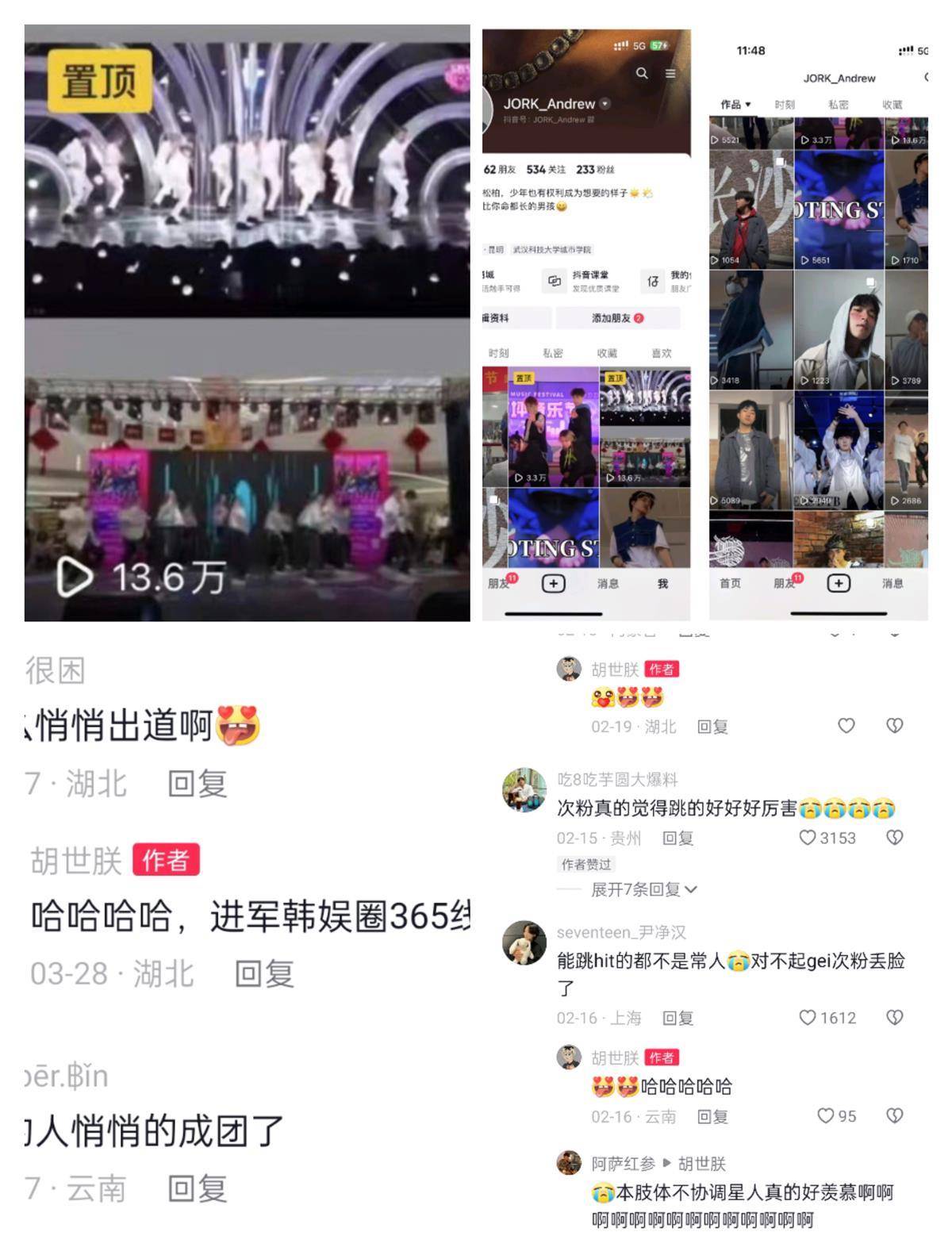 “今天就是最閃亮的星。”4月4日,極目新聞記者從武漢城市學院獲悉,日前該校外語學部2022級英語專業(yè)4班學生胡世朕一段K-POP比賽的短視頻在他個人視頻賬號上“火了”。他的視頻賬號主要記錄和分享練舞過程,其中街舞《HIT》的播放量高達13.6萬人次,視頻號總播放量達50萬人次。