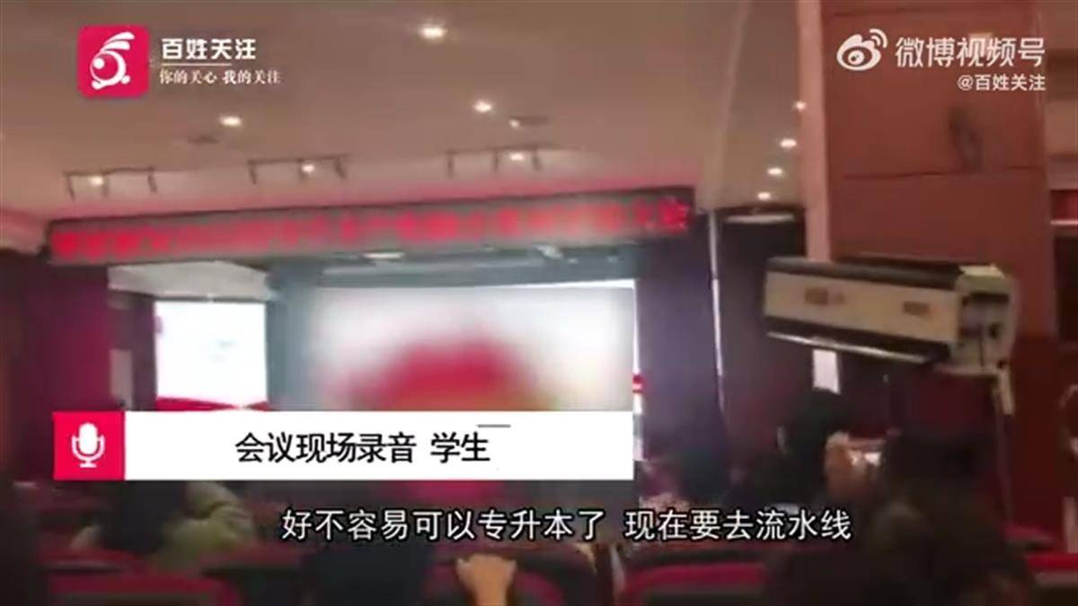 學(xué)生曝光的會場視頻中,很多學(xué)生都對學(xué)校的宣傳動員感到反感,現(xiàn)場就提出了異議。有學(xué)生很氣憤地對記者表示:“好不容易專升本了,現(xiàn)在要去流水線,支付了2萬多的學(xué)費(fèi),卻被派到一個(gè)月2000元的崗位去實(shí)習(xí),還不叫實(shí)習(xí),美其名曰叫‘學(xué)習(xí)’。”