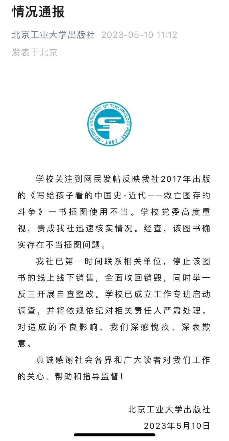 記者注意到,5月10日11:12,北京工業大學出版社發布情況通報。(此前報道:北京工業大學出版社:深表歉意!全面收回銷毀!)通報稱,“學校關注到網民發帖反映我社2017年出版的《寫給孩子看的中國史·近代——救亡圖存的斗爭》一書插圖使用不當。學校黨委高度重視,責成我社迅速核實情況。經查,該圖書確實存在不當插圖問題。我社已第一時間聯系相關單位,停止該圖書的線上線下銷售,全面收回銷毀,同時舉一反三開展自查整改。學校已成立工作專班啟動調查,并將依規依紀對相關責任人嚴肅處理。對造成的不良影響,我們深感愧疚、深表歉意。真誠感謝社會各界和廣大讀者對我們工作的關心、幫助和指導監督!”