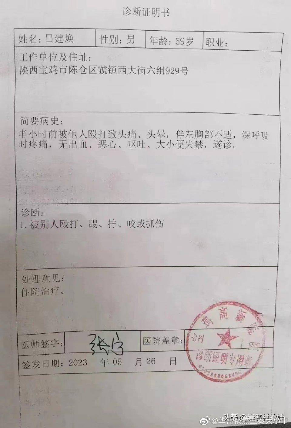 在網絡上一份寶雞高新醫院出具的診斷書顯示,呂某某半小時前被他人毆打致頭痛、頭暈,伴左胸部不適,深呼吸時疼痛,無出血,惡心、嘔吐、大小便失禁。被診斷為被別人毆打,踢、擰、咬或抓傷,醫生建議住院治療。