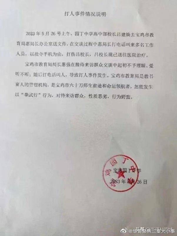 5月26日,一則“陜西省園丁中學校長被寶雞市教育局長喊人打到大小便失禁住院”的消息引各方關注。