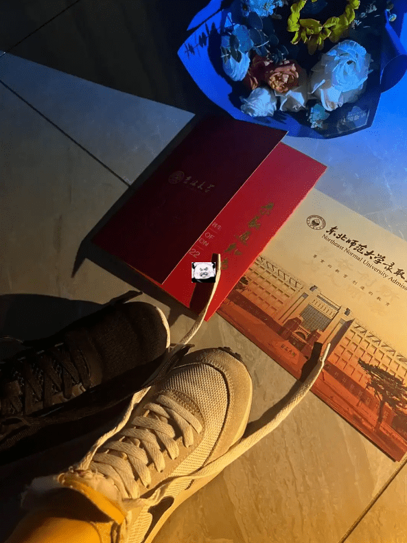 相比之下這名學(xué)生的就理所當然多了,看這兩條鞋帶的方向,多么明顯,徑直的就指向了錄取通知書。好家伙,原來是東北師范大學(xué),怪不得旁邊還放了一束花,真是恭喜恭喜啊。