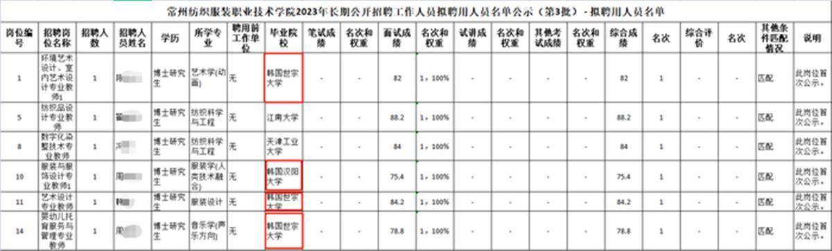 近日,常州紡織服裝職業技術學院2023年長期公開招聘工作人員擬聘用人員名單公示(第3批)引發網友關注,因公示的6名擬聘用人員中有3名為韓國同一私立大學博士,且均為面試錄取,有網友質疑系“蘿卜招聘”。23日,該校工作人員稱,他們的招聘符合流程,并已向上級部門進行了說明。江蘇省教育廳人事處工作人員表示,將對此事進行調查了解。