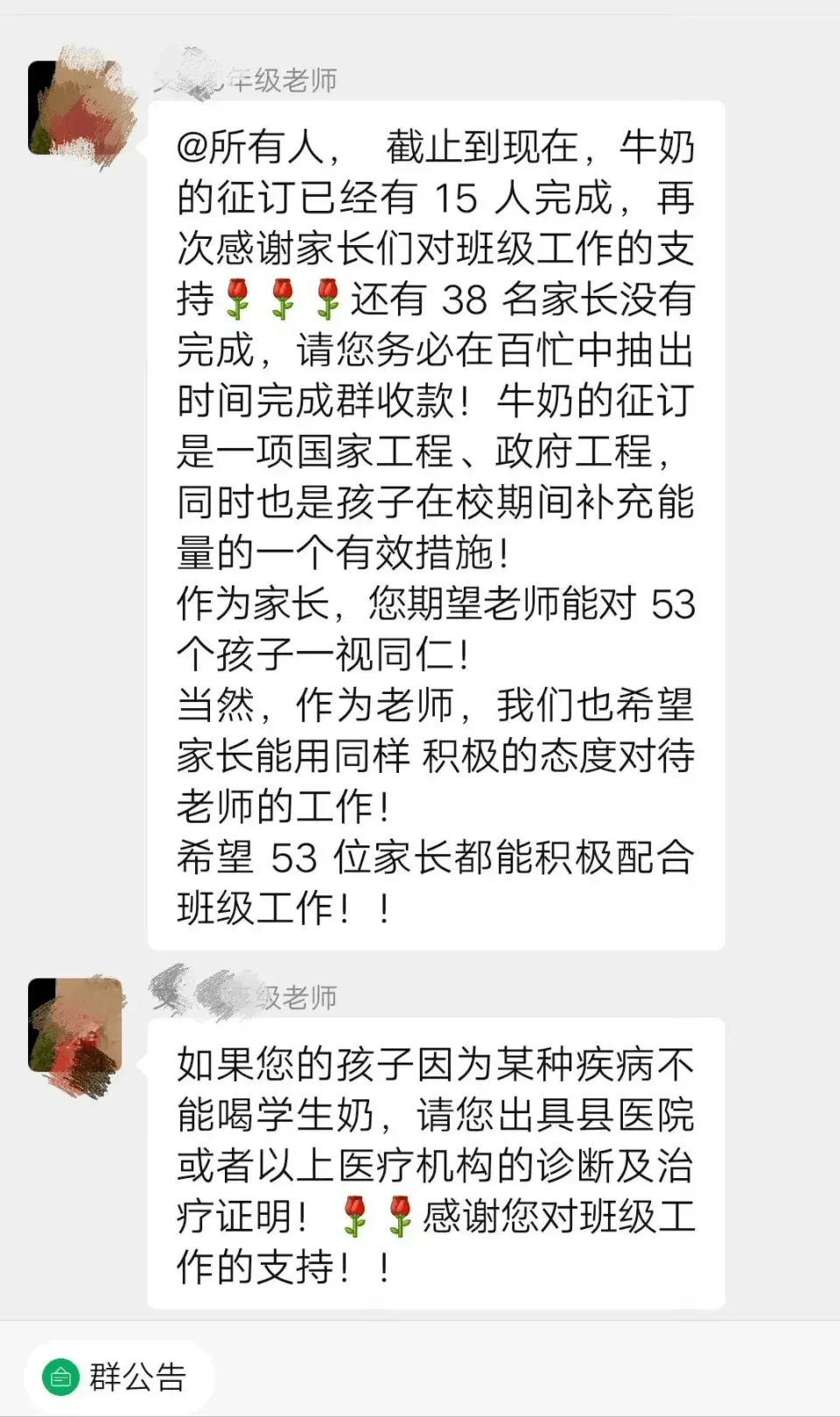 爸爸少抽一條煙,媽媽少買一條裙子,就能給孩子訂一份“學生奶”。如果您的孩子因為某種疾病不能能“學生奶”,請您出具縣級或以上醫療機構的診斷及治療證明!——某學校老師在班級微信里發給家長的信息。