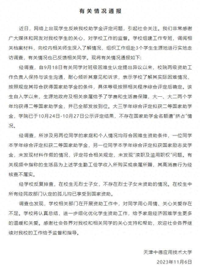 11月6日,天津中德應(yīng)用技術(shù)大學(xué)通報,近日,網(wǎng)絡(luò)上出現(xiàn)學(xué)生反映該校助學(xué)金評定問題,引起社會關(guān)注。學(xué)校非常感謝廣大媒體和網(wǎng)友對該校學(xué)生的關(guān)心,對學(xué)校工作的監(jiān)督。學(xué)校組建工作專班,調(diào)閱相關(guān)檔案材料,向校內(nèi)相關(guān)師生深入了解情況,組織工作組赴3個學(xué)生生源地進行實地走訪調(diào)查,有關(guān)情況也已反饋相關(guān)同學(xué)。現(xiàn)將有關(guān)情況通報如下: