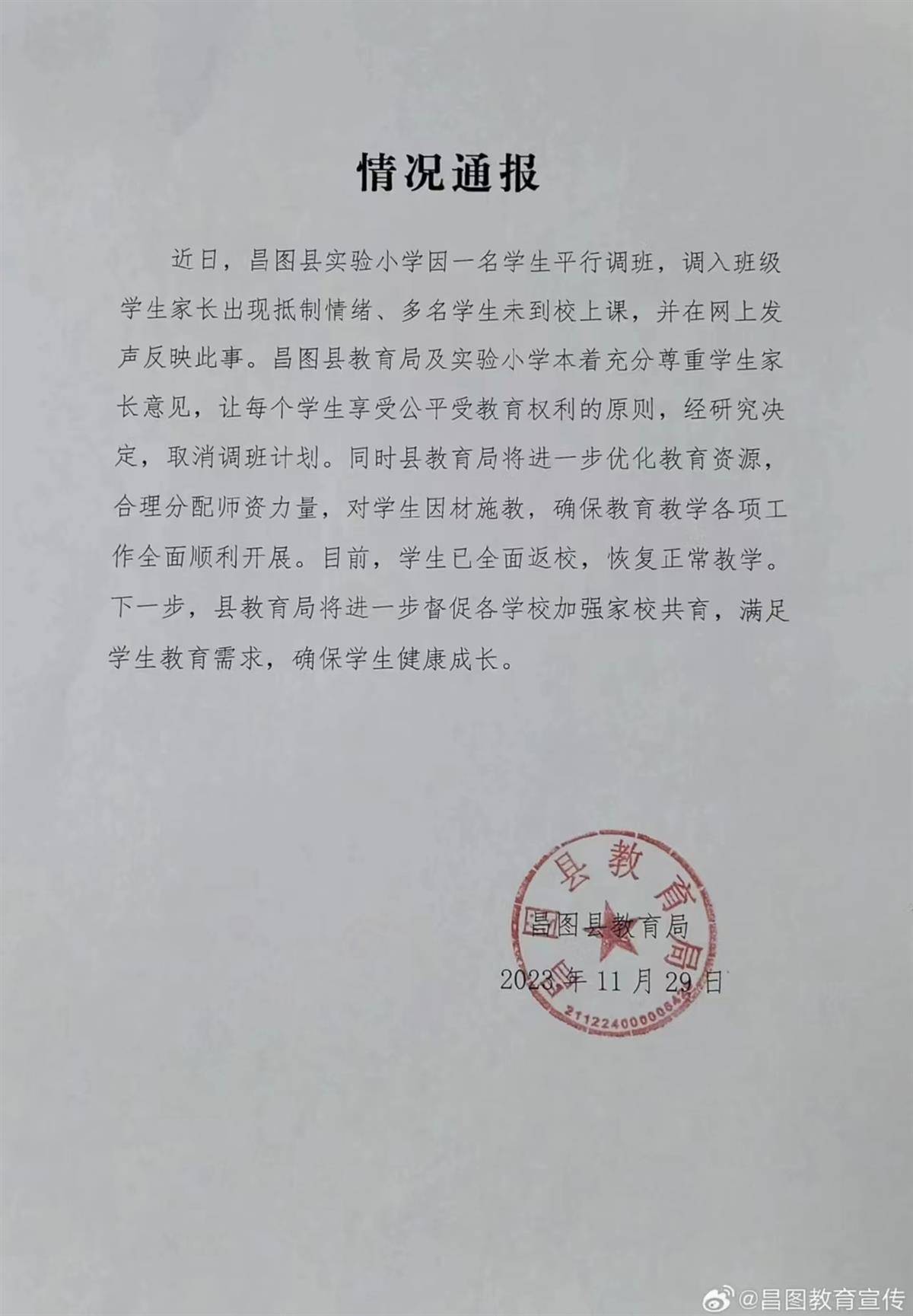 昌圖縣教育局發布的情況通告稱,近日,昌圖縣實驗小學因一名學生平行調班,調入班級學生家長出現抵制情緒、多名學生未到校上課,并在網上發聲反映此事。昌圖縣教育局及實驗小學本著充分尊重學生家長意見,讓每個學生享受公平受教育權利的原則,經研究決定,取消調班計劃。同時縣教育局將進一步優化教育資源,合理分配師資力量,對學生因材施教,確保教育教學各項工作全面順利開展。目前,學生已全面返校,恢復正常教學。下一步,縣教育局將進一步督促各學校加強家校共育,滿足學生教育需求,確保學生健康成長。