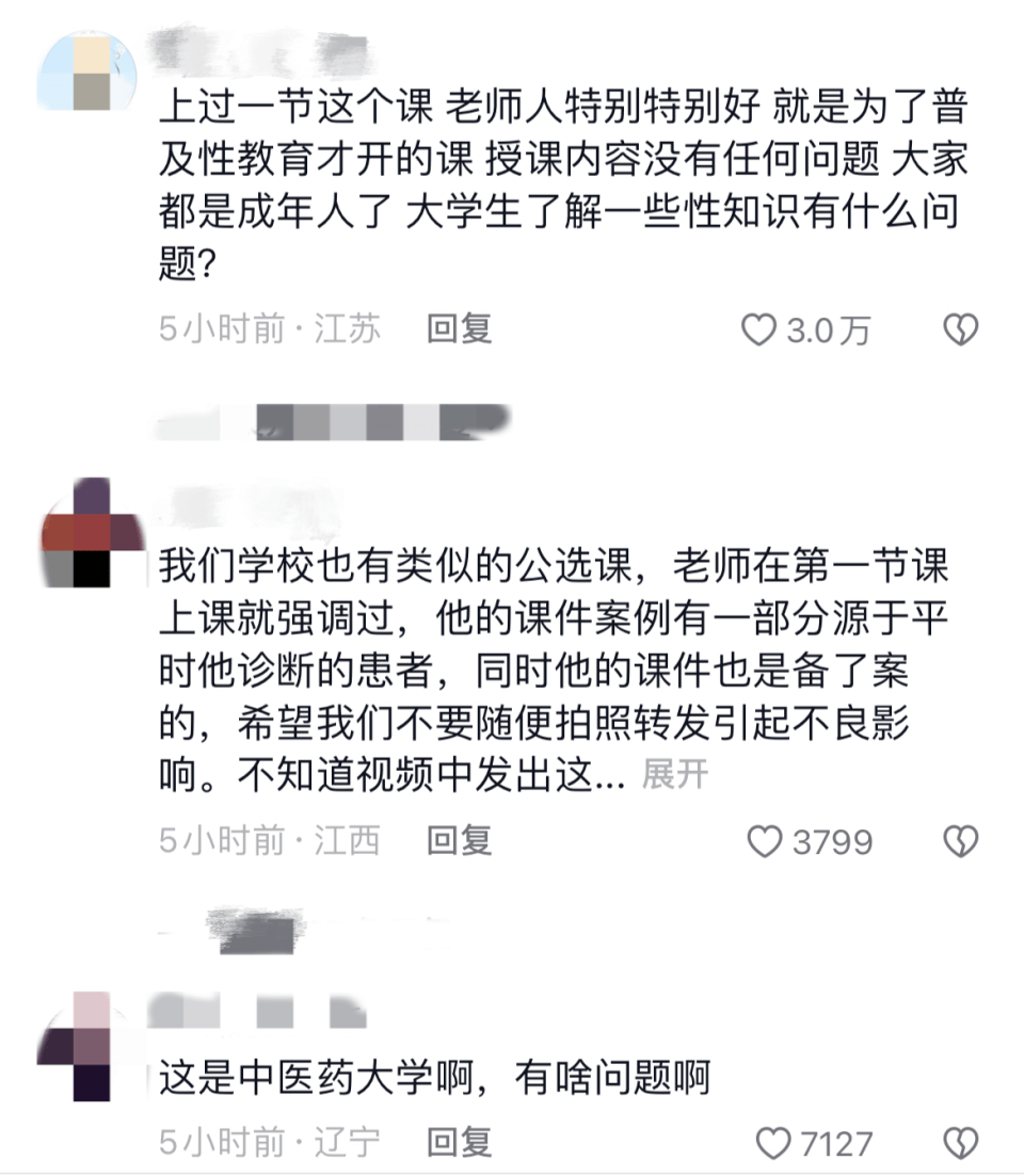 一些網(wǎng)友認為課件內容過于露骨,不宜在課堂上出現(xiàn)。也有網(wǎng)友直言課程沒有問題,“這是中醫(yī)藥大學有啥問題”“學醫(yī)的啥沒見過”“醫(yī)學面前不分男女”……