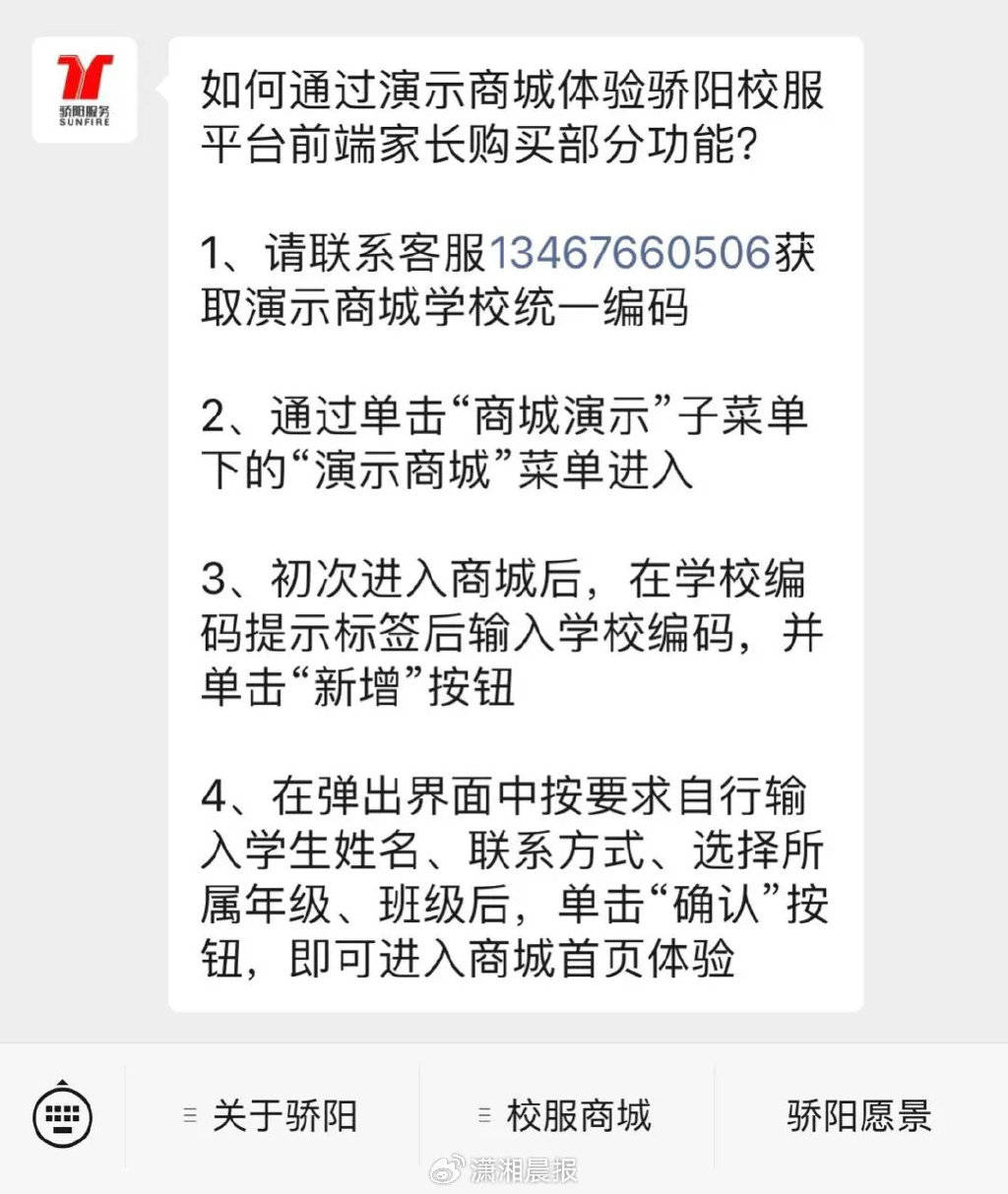 通過(guò)查詢,記者發(fā)現(xiàn),這個(gè)域名的申請(qǐng)主體是湖南驕陽(yáng)數(shù)智科技有限公司(以下簡(jiǎn)稱(chēng)“驕陽(yáng)公司”)。12月10日,記者在該公司的“驕陽(yáng)數(shù)智校服平臺(tái)”公眾號(hào)上看到,該號(hào)提供了演示版本的校服商城,可以體驗(yàn)驕陽(yáng)校服平臺(tái)的購(gòu)買(mǎi)功能。操作方式顯示:初次進(jìn)入商城后,在學(xué)校編碼提示標(biāo)簽后輸入學(xué)校編碼,在彈出界面中按要求自行輸入學(xué)生姓名、聯(lián)系方式、選擇所屬年級(jí)、班級(jí)后,單擊“確認(rèn)”按鈕,即可進(jìn)入商城首頁(yè)體驗(yàn)。