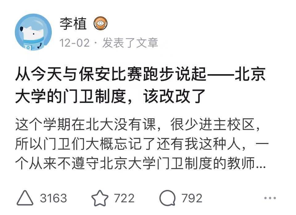 “北大的這種門衛(wèi)管理制度給師生造成了很大不便,上下班高峰時,北大東門的閘機前常常排起長隊。門口執(zhí)勤的保安都很辛苦,但是這種嚴防死守的模式不適用于大學(xué),我們真正希望看到的保安應(yīng)當更關(guān)注校內(nèi)公共場所,而不是站在門口。尤其是連出門也要管,毫無必要。”李植在文中寫道。