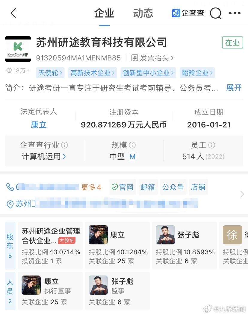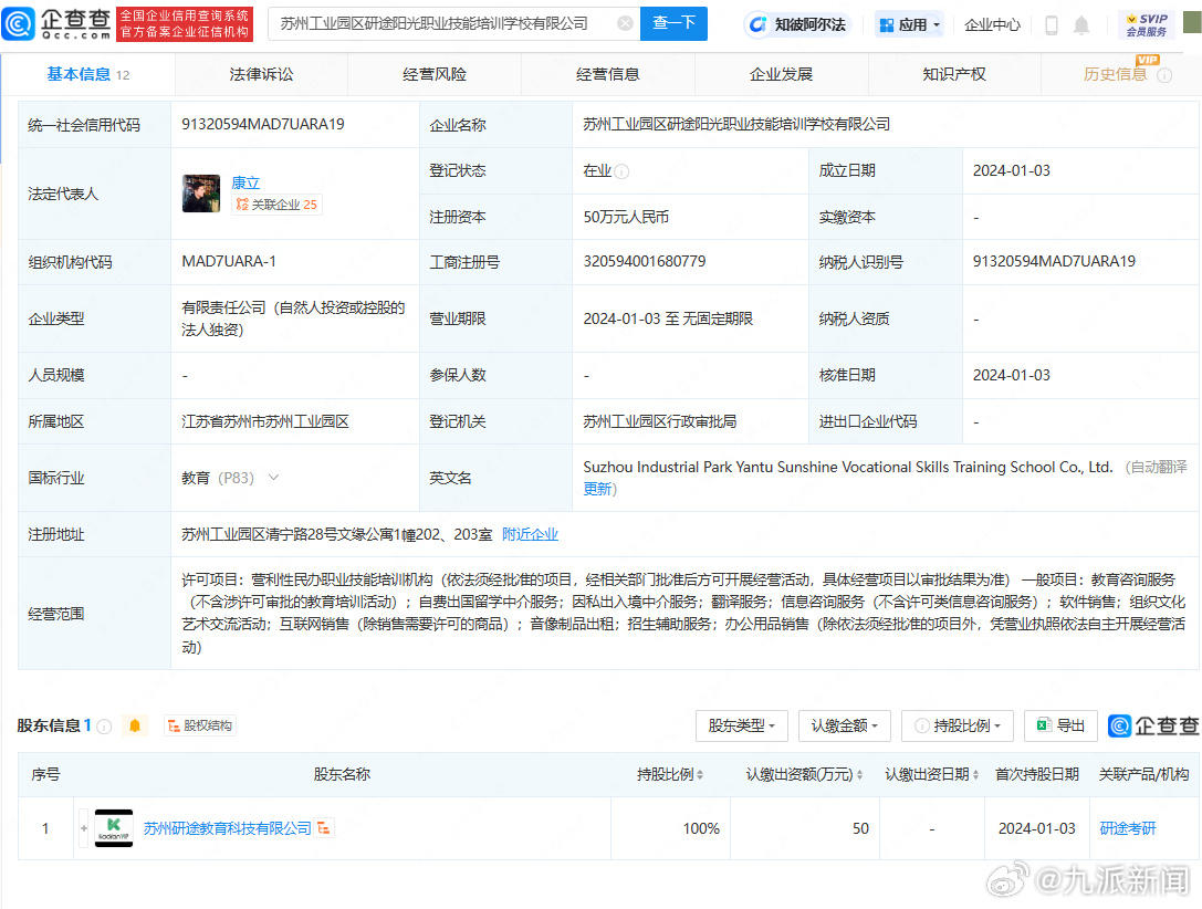 企查查APP顯示,近日,蘇州工業園區研途陽光職業技能培訓學校有限公司成立,法定代表人為康立,注冊資本50萬人民幣,經營范圍含營利性民辦職業技能培訓機構、教育咨詢服務、自費出國留學中介服務、招生輔助服務等。企查查股權穿透顯示,該公司由蘇州研途教育科技有限公司全資持股,張子彪(張雪峰)擔任后者監事并持股約10.86%。公開信息顯示,張雪峰為蘇州研途教育科技有限公司聯合創始人。