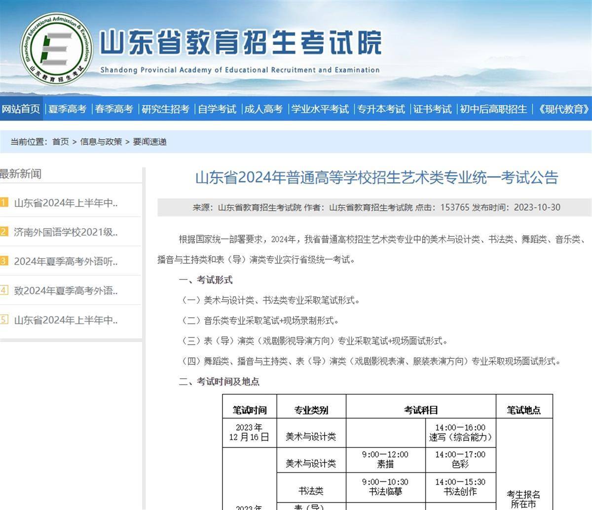 根據《山東省2024年普通高等學校招生藝術類專業統一考試公告》。2024年山東省普通高校招生藝術類專業中的美術與設計類、書法類、舞蹈類、音樂類、播音與主持類和表(導)演類專業實行省級統一考試。筆試時間為2023年12月16日至17日,面試時間為2023年12月20日至30日。其中,美術與設計類采取筆試形式,考試科目包括速寫、素描、色彩等。