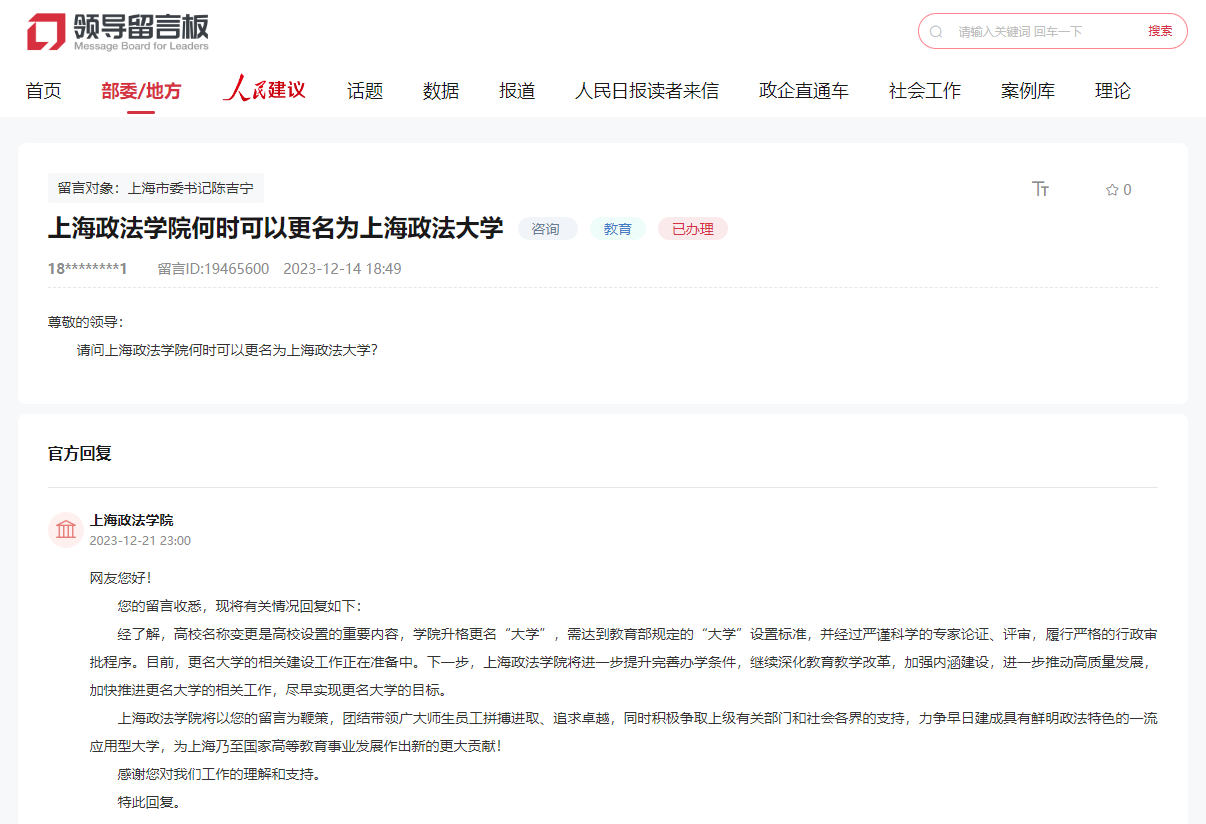 近日,有網(wǎng)友在人民網(wǎng)領(lǐng)導(dǎo)留言上咨詢,“上海政法學(xué)院何時(shí)可以更名為上海政法大學(xué)?”