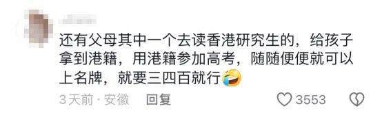 “父母其中一個去讀香港研究生,給孩子拿到港籍,用港籍參加高考,隨隨便便就可以上名校,只要三四百分就行。”