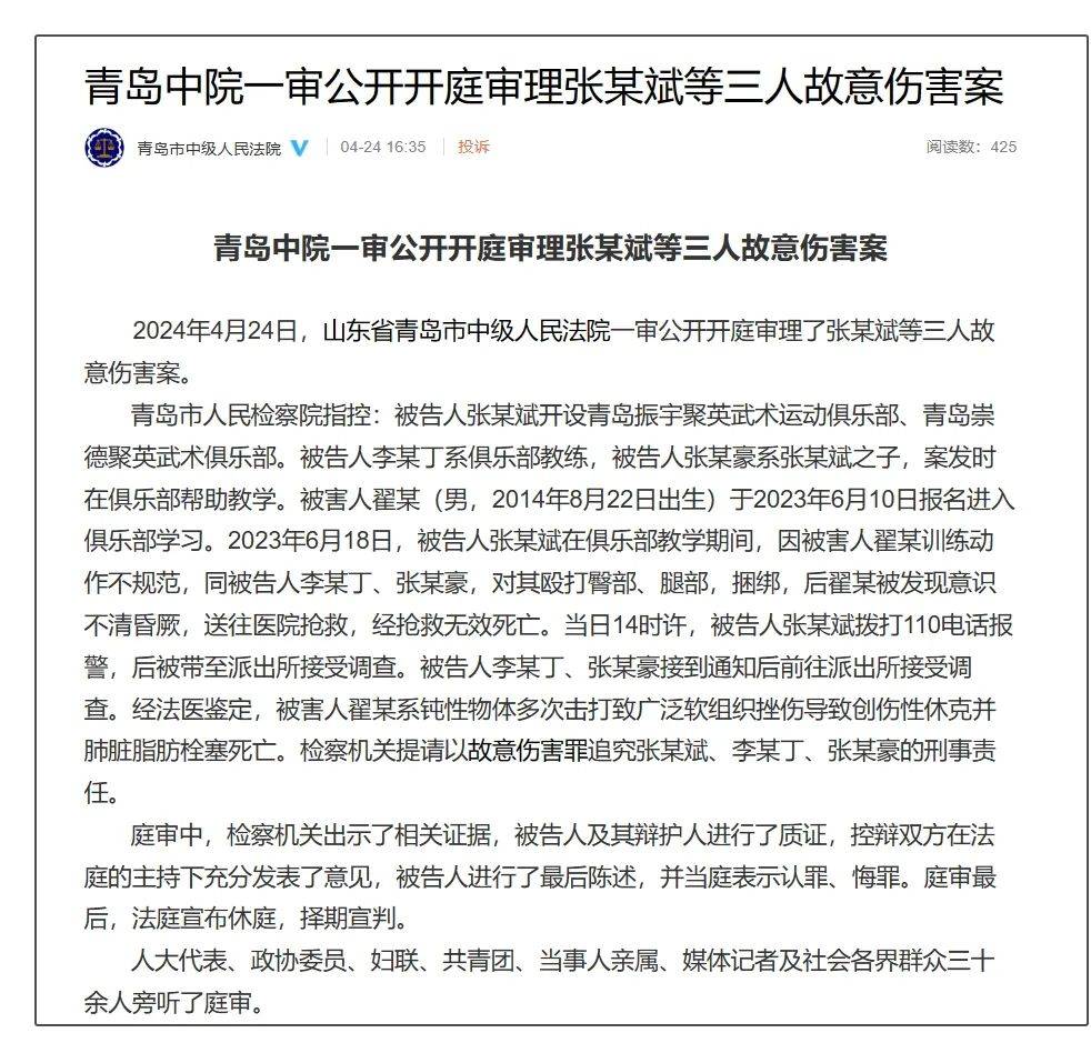 據@青島市中級人民法院 4月24日消息,2024年4月24日,山東省青島市中級人民法院一審公開開庭審理了張某斌等三人故意傷害案。