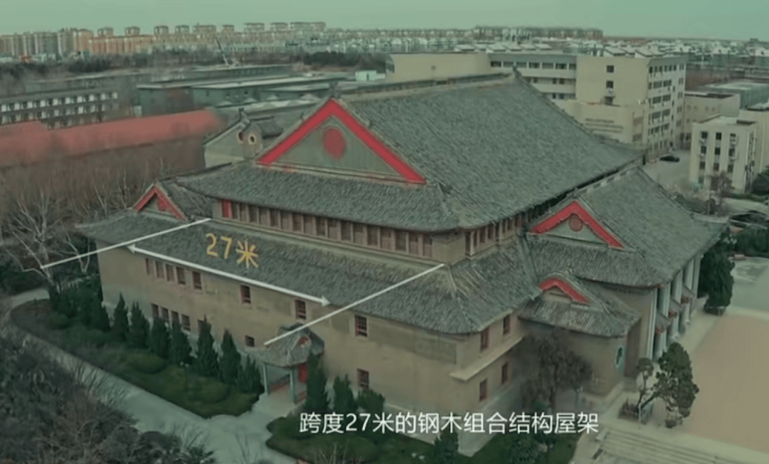 大禮堂運(yùn)用了當(dāng)時(shí)最先進(jìn)的技術(shù),尤其是選用了27米英國(guó)進(jìn)口鋼屋架,創(chuàng)造了當(dāng)時(shí)全國(guó)最大的大跨度空間。