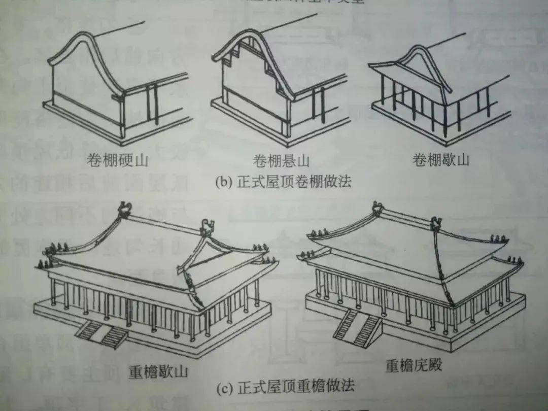 重檐歇山——大禮堂采用了中式建筑中宏偉的重檐歇山頂,這可是僅次于重檐廡殿的屋頂形制。中國(guó)古代建筑的屋頂式樣非常豐富。等級(jí)低者有硬山頂、懸山頂,等級(jí)高者有廡殿頂、歇山頂。廡殿頂、歇山頂、攢尖頂?shù)扔钟袉伍?,重檐之別,攢尖頂則有圓形、方形、六角形、八角形等變化形式。(如下圖)