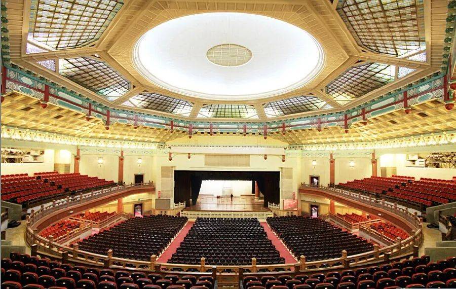 建筑平面按功能將門廳、觀眾廳、舞臺(tái)三部分沿南北中軸線分布,看臺(tái)分池座、樓座上下兩層,有觀眾席2816個(gè)。