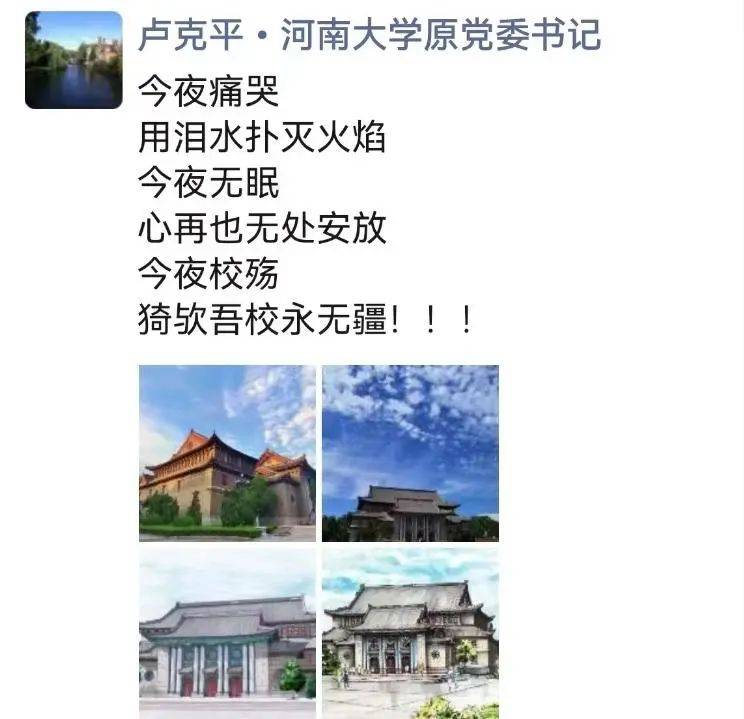 火災(zāi)之后的凌晨2時(shí)36分,河南大學(xué)原黨委書記盧克平發(fā)帖:今夜痛哭,用淚水撲滅火焰。今夜無眠,心再也無處安放。今夜校殤,猗歟吾校永無疆!!!