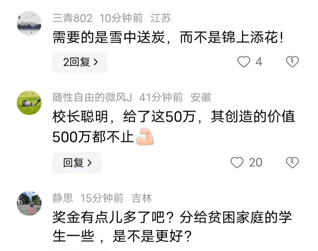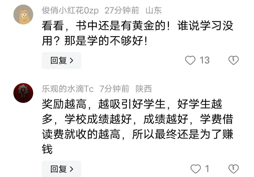 有網(wǎng)友表示獎(jiǎng)勵(lì)越高就越吸引學(xué)生,好學(xué)生就越多,學(xué)校就用這種方式來吸引更多的學(xué)生努力學(xué)習(xí),所以學(xué)習(xí)是很有用的!
