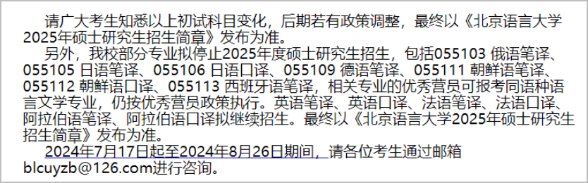摘要: 原標題:重磅!知名外語高校 擬停招7個外語專業 近日,北京語言大學研究生院發布公告,2025年擬停招俄語筆譯、日語筆譯、日語口譯、德語筆譯、朝鮮語