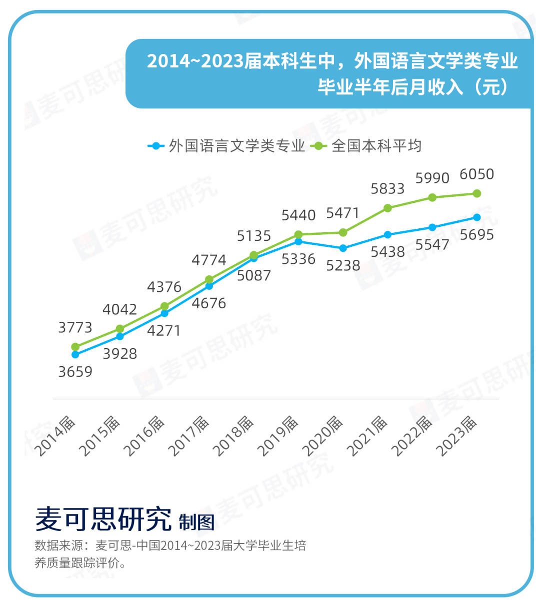 根據歷年《中國本科生就業報告》數據,近十年,外國語言文學類專業應屆本科生的初始薪資雖然穩步上漲,從2014屆的3659元增至2023屆的5695元,但近幾年與全國本科生平均薪資的差距卻在拉大。