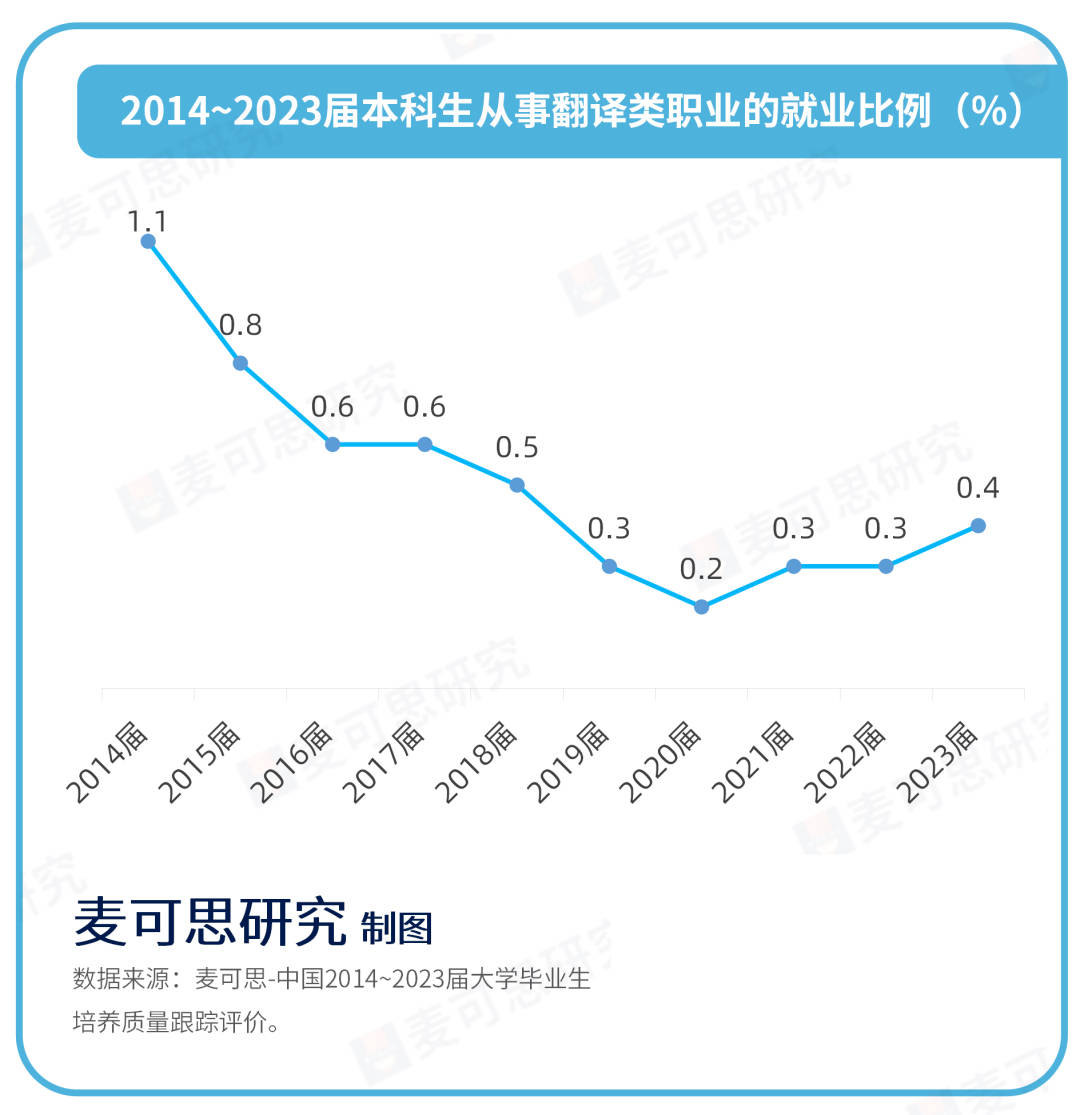 而媒體口中“首批因AI失業”的翻譯崗位,吸納大學畢業生的能力則的確在下降。麥可思數據顯示,應屆本科生從事翻譯類職業的比例由2014屆的1.1%一路降至2020屆的0.2%。近三屆雖略有回升,2023屆為0.4%,但近十年就業占比降幅也達到175%。