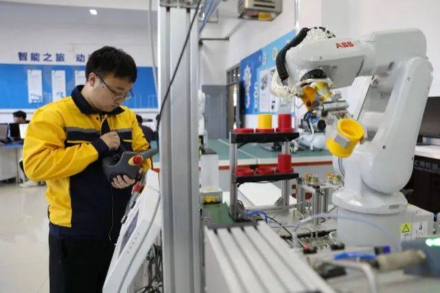 山東水利職業學院工業機器人實訓中心,學生進行編程操控機器人。