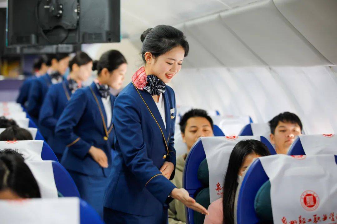 空中乘務專業的學生正在進行安全提醒服務訓練。