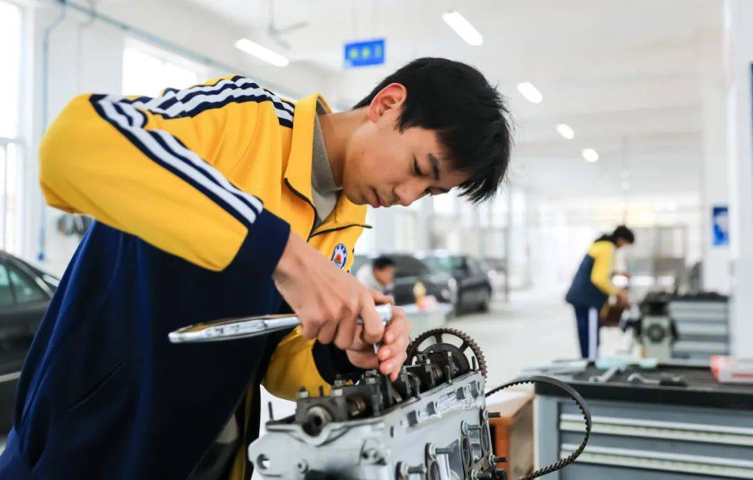 學生在汽車應用與維修實訓室進行發動機拆裝訓練。