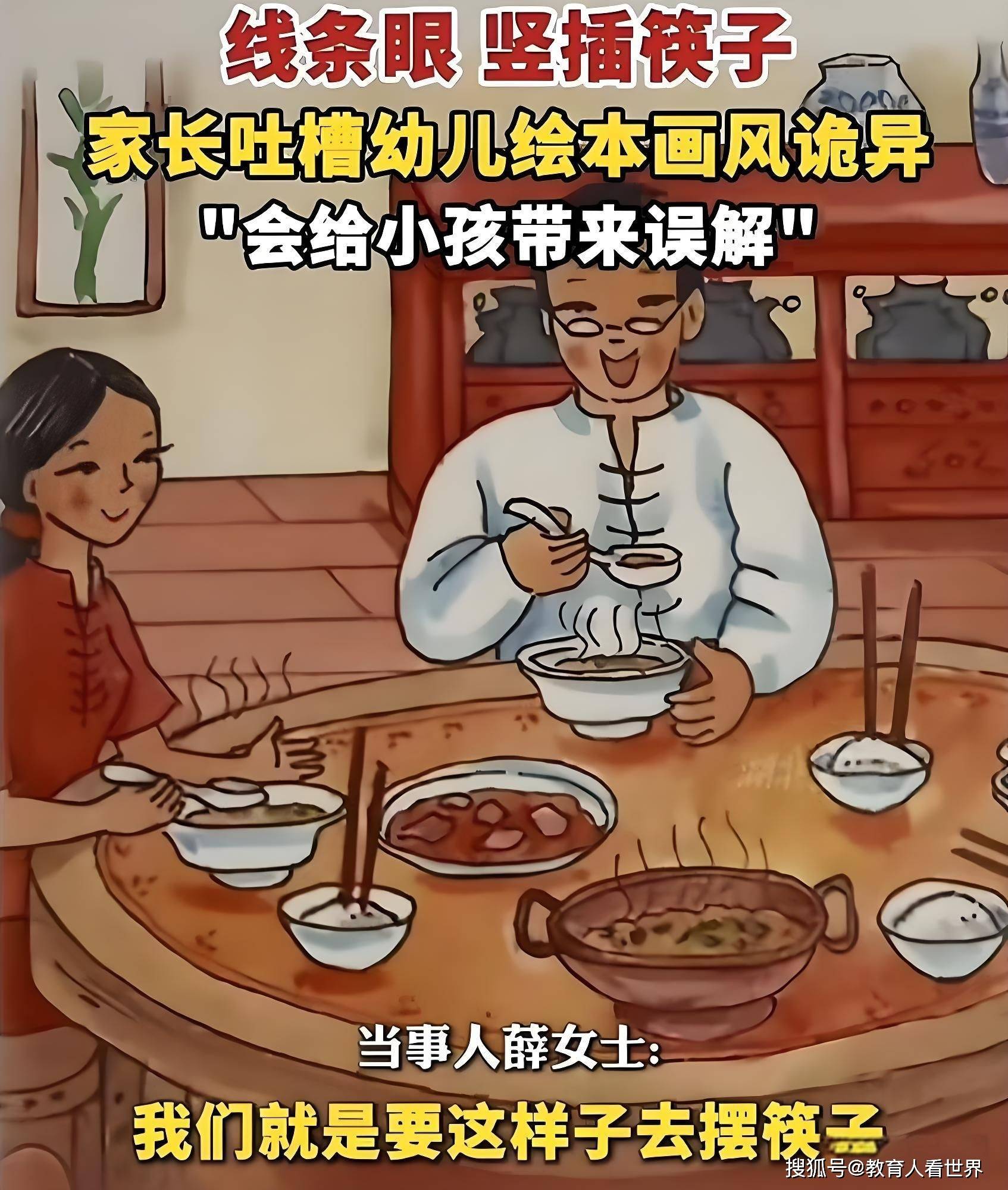 近日,博主926薛寒發視頻反映,自己購買的兒童讀物上,有一家人圍桌吃飯,米飯上豎插筷子的場景,吐槽,我們小時候要是這樣擺放碗筷,會被家長狠揍一頓。這樣的兒童讀物,會讓孩子誤讀傳統習俗。而且,畫風怪異,大部分人物還是毒教材上一樣的線條狀瞇瞇眼。博主反映,該兒童繪本還是全國知名出版社出版的。
