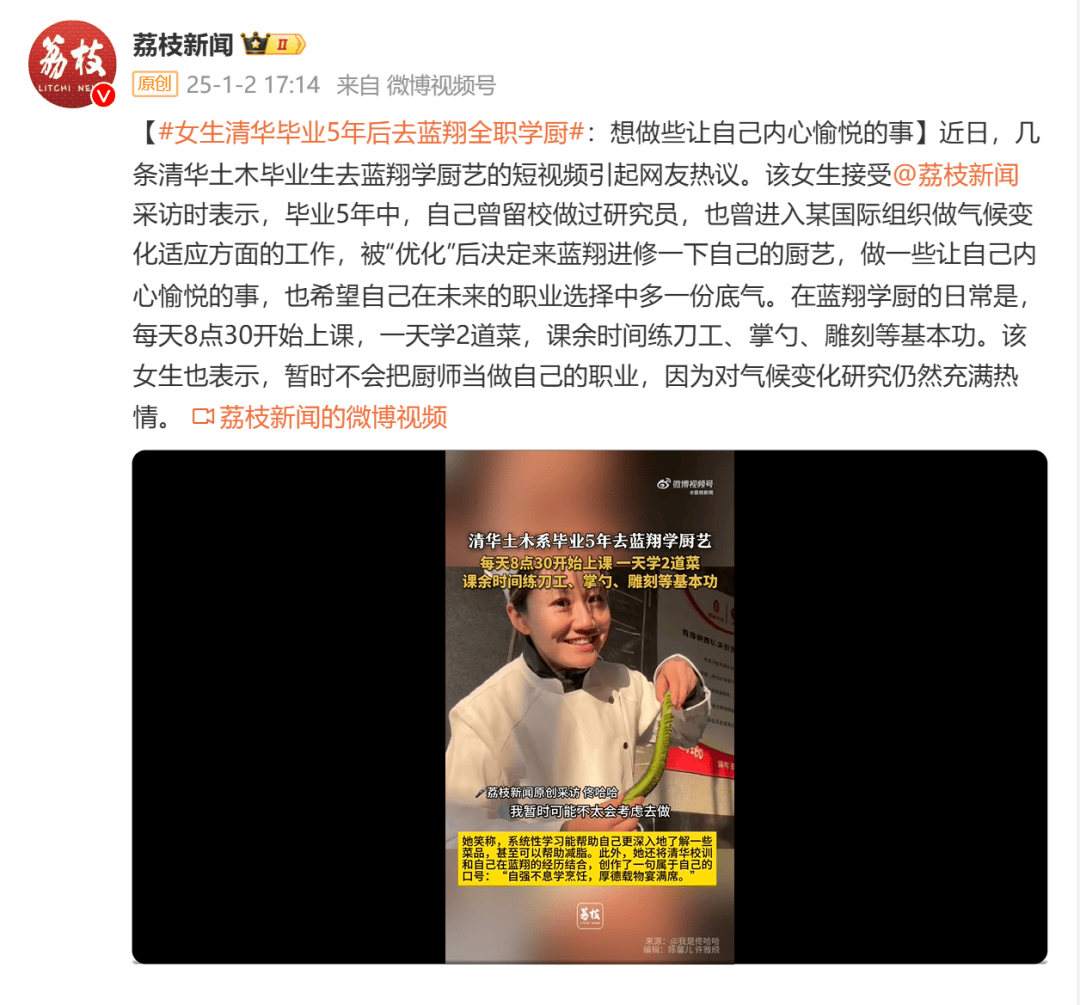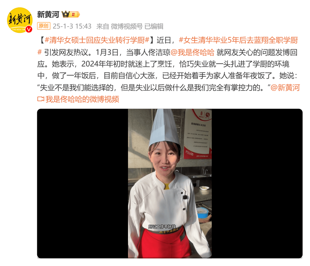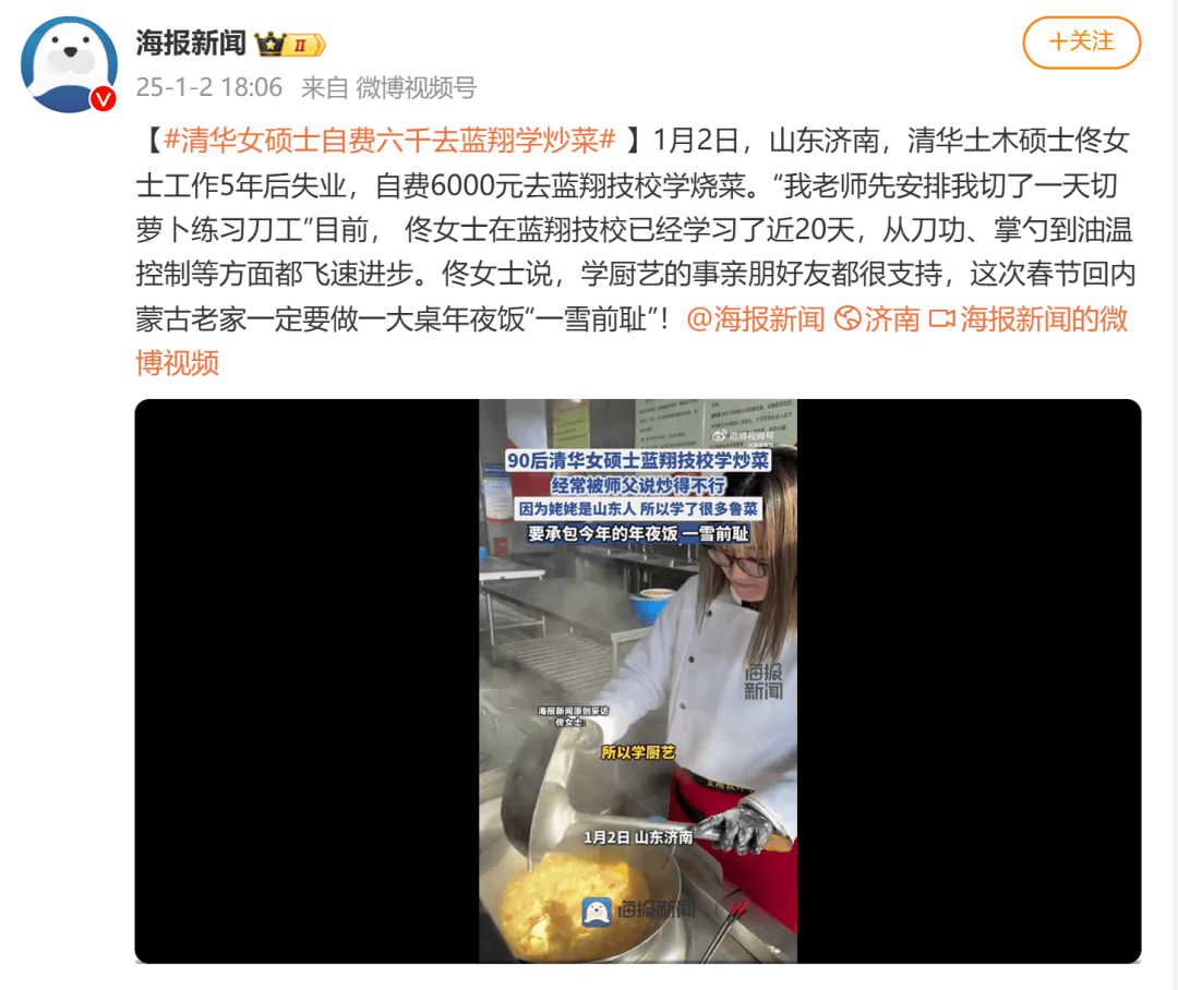 原標題:清華女碩士失業學廚引熱議!本人說想接地氣 目前自信心大漲
