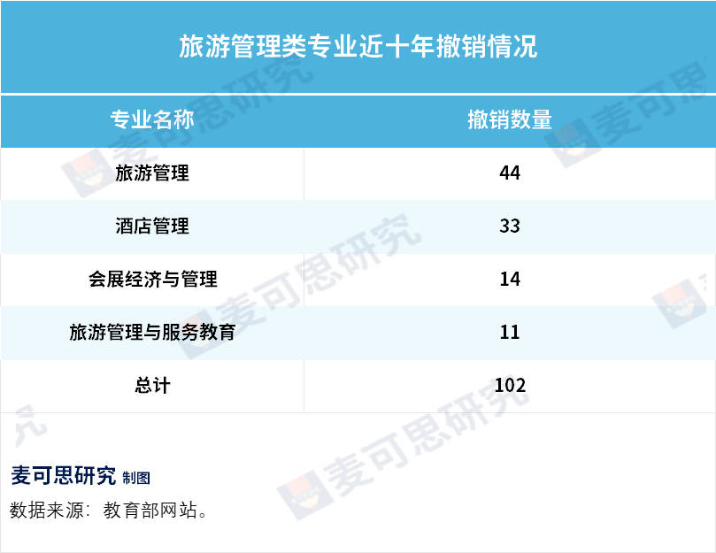 對本科高校撤銷專業名單的統計發現,近十年,撤消旅游管理類專業的數量共計有102個,居于全國各專業類撤銷專業數量TOP20之列。其中,除了上文提到的旅游管理專業,十年撤銷了44個以外,酒店管理撤銷數量也較多,撤銷了33個。另外,會展經濟與管理專業撤銷了14個,旅游管理與服務教育撤銷了11個。