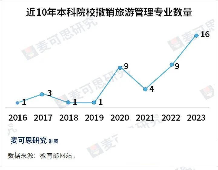 這或是近年來撤銷旅游管理專業的本科高校數量增加的原因。2023年,有16所本科高校撤銷了該專業。從1998年正式進入《普通高等學校本科專業目錄新舊專業對照表》,旅游管理專業已有近30年的發展歷史。較長的學科專業設置時間意味著經過較長時間的積淀,相關學科專業教學經驗和軟硬件資源或將更豐富,但可能也意味著,若無法與時俱進對課程教學和人才培養方案進行及時的修訂,人才培養將很難跟上時代的步伐。