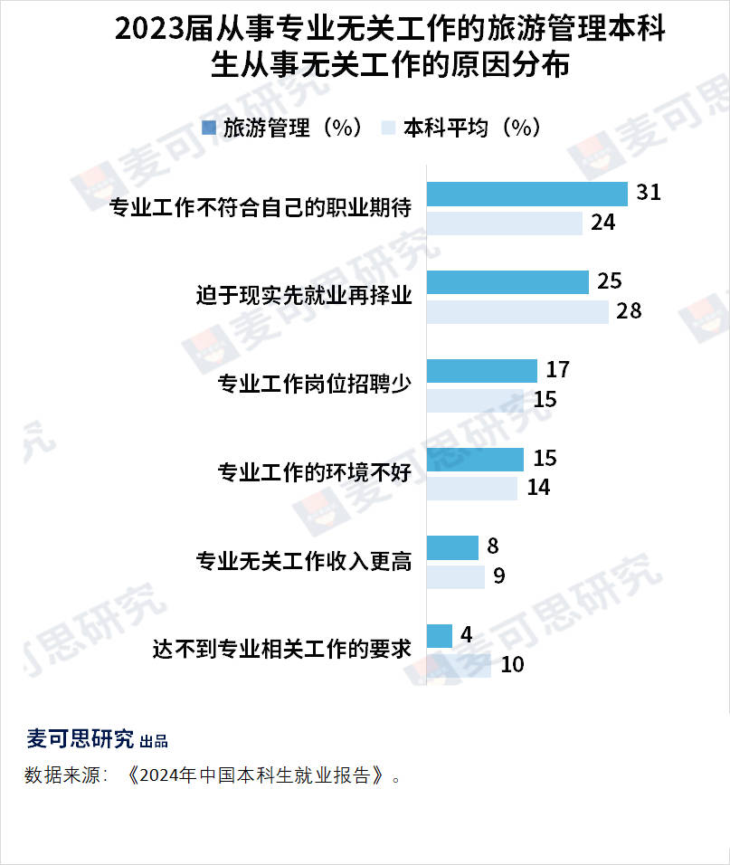 另外,深入分析從事專業無關工作的旅游管理畢業生的擇業主因我們發現,因為“專業工作不符合自己的職業期待”(31%)而選擇專業無關工作的居多,明顯高于本科平均(24%)。這說明,需要加強對本專業的新生入學教育和職業前瞻教育,以讓其做好相應的職業準備。