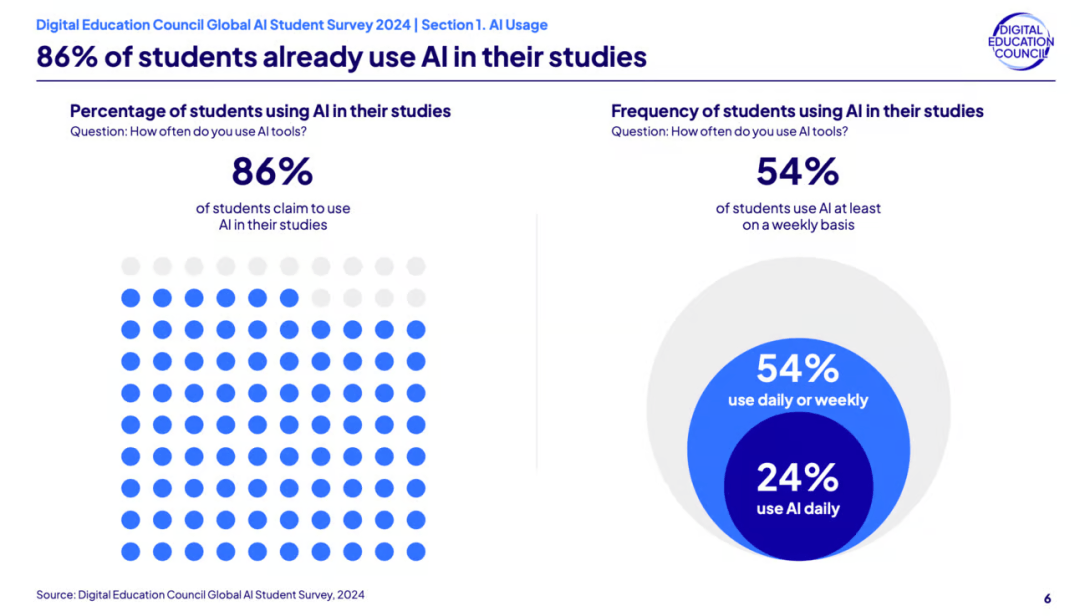 數字教育委員會(DEC)調查顯示,2024年春季學期,86%的美國大學生在學業上使用了AI工具