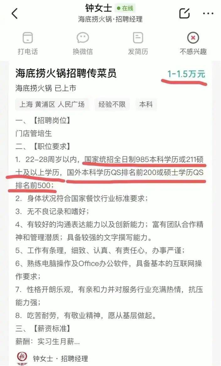 甚至海底撈招聘傳菜員都有相當高的門檻——22-28周歲以內,國家統招全日制985本科學歷或211碩士及以上學歷,國外本科學歷QS排名前200或碩士學歷QS排名前500,emmmm鷗醬不禁感嘆自己連火鍋店傳菜員的門檻都過不去。