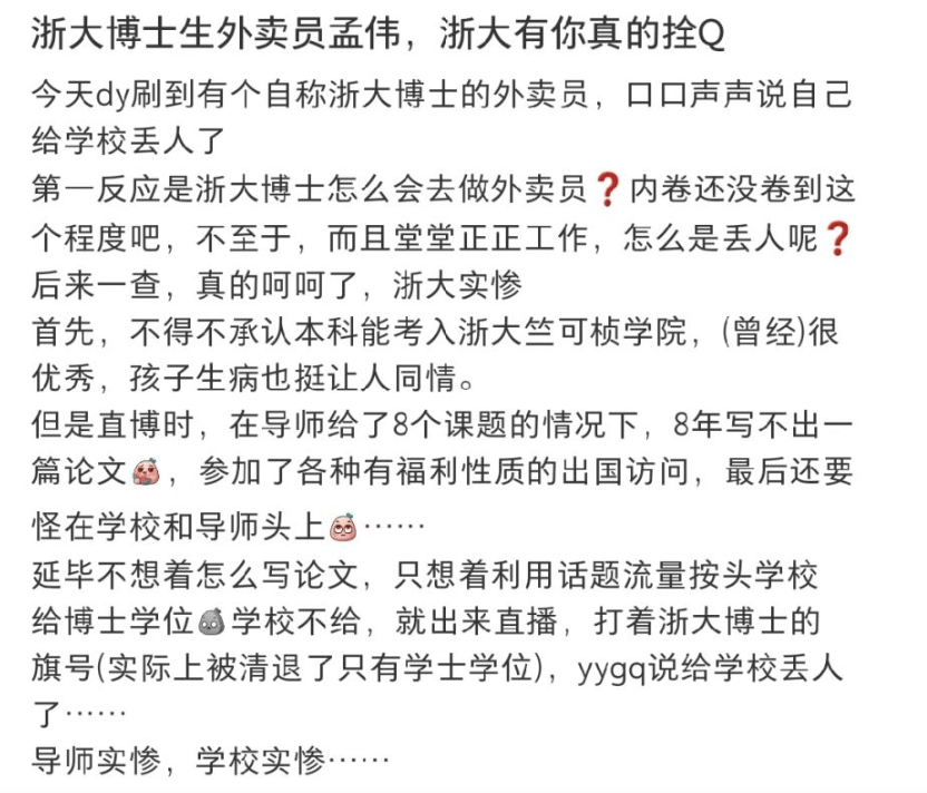 事后有人扒出來其實 他在攻讀博士學位期間,在導師給了八個課題的情況下,花費八年都寫不出一篇論文,被指責是以浙大title博流量,人品和學術能力都堪憂......
