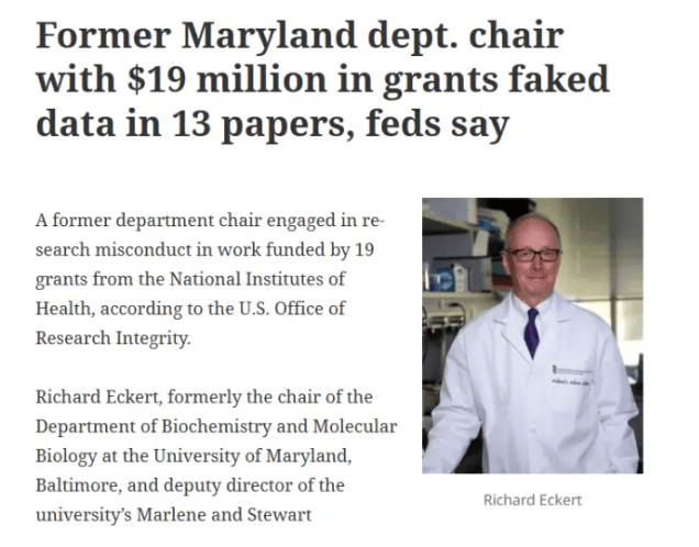 知名美國高校馬里蘭大學生化與分子生物學系主任理查德?埃克特,就卷入了一場嚴重的學術不端事件。他的論文中使用了大量PS 過的 Western Blot 與顯微成像結果,PS 手法還極其簡陋,不借助專業(yè)工具就能看到明顯的裁剪與拼接痕跡 。
