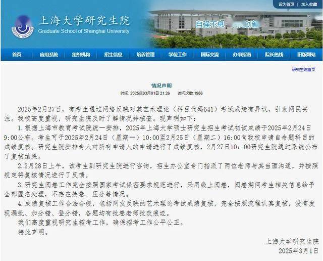 3月1日晚,上海大學研究生院官網發布《情況聲明》,表示考研研究生閱卷工作完全按照國家考試保密要求規范進行,不存在換卷、壓分等情況;成績復核工作合法合規,沒有發現漏批、加分錯、登分錯,各題均有批卷老師批改痕跡。