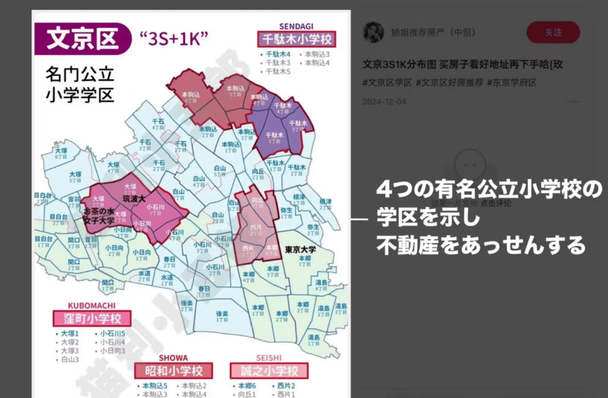 許多家長愿意在東京大學附近購房,首選區域是文京區(東京23區之一,東大所在地),其次是港區、中央區、千代田區、新宿區等精英學區。