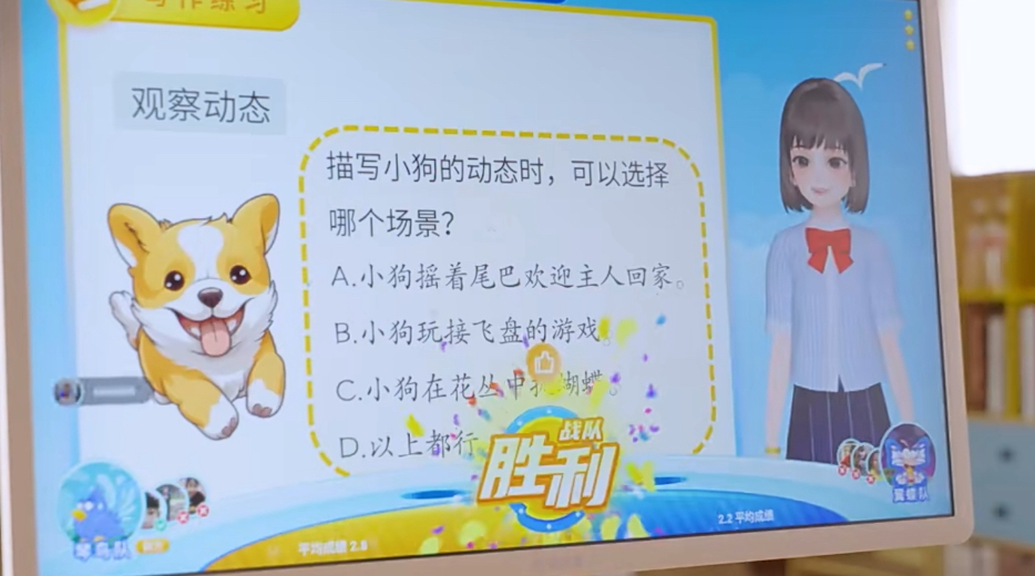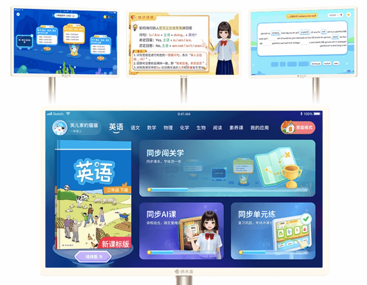 大屏機已內置匹配新課標的1-9年級全科學習內容,同時提供預習、復習、練習、拓展鏈路的學習規劃。納米盒旗下的AI互動式課堂、AI課程、以及同步練等資源也都搭載在其中。另外,其同步學內容產品,已經融入AI與數字人元素。