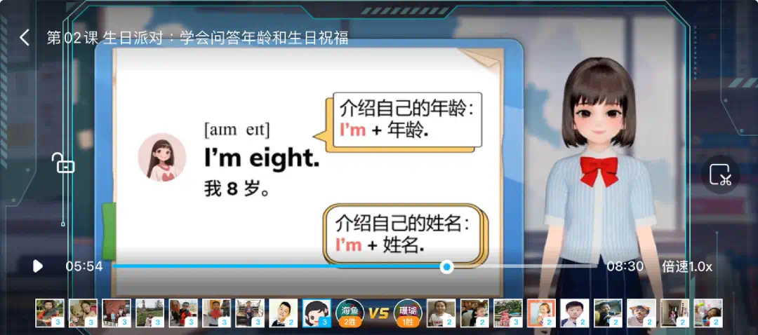 在納米盒此前的文生動畫互動課上,虛擬人物也充當了課程中的講解、引導和陪伴的角色。例如,米娜學姐會帶著學生一起學習和拼讀音標、單詞;會通過實用句子講解用法與考點;會通過情景對話來做學生的評測和發音糾正等等。