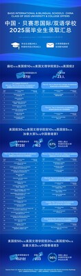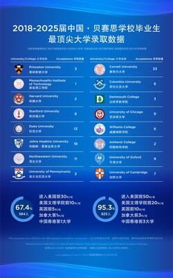2025年,是中國•貝賽思學校辦學十周年,2025屆學生,亦是中國•貝賽思學校向全球大學輸送的第七屆畢業生。從2018年第一名學生畢業到今年,歷屆畢業生在學術道路上連攀新峰,六大校區總共910名畢業生收獲了5.250份全球大學錄取通知書,獲得大學獎學金總額超過2.238萬美元。其中866名學生申請學術類大學,有11%的學生收到常春藤盟校和/或美國排名前10的綜合大學和/或美國排名前2的文理學院和/或英國排名前2的大學的132份錄取通知,包括普林斯頓大學3份、麻省理工學院1份、哈佛大學2份、斯坦福大學6份、杜克大學13份、約翰斯•霍普金斯大學19份、西北大學11份、賓夕法尼亞大學2份、康奈爾大學33份、哥倫比亞大學6份、達特茅斯學院3份、芝加哥大學9份、威廉姆斯學院6份、阿默斯特學院2份、牛津大學9份、劍橋大學7份。67.4%的學生被美國排名前30和/或美國文理學院排名前10和/或英國排名前5和/或加拿大排名第1和/或中國香港排名第1的大學錄取,95.3%的學生被美國排名前50和/或美國文理學院排名前20和/或英國排名前10和/或加拿大排名前3和/或中國香港排名前3的大學錄取。