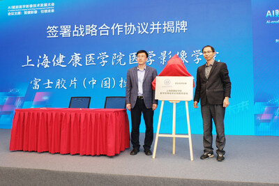 上海健康醫學院醫學影像學院李曉歐院長與富士膠片智慧醫療技術培訓中心副所長陳杰共同為“上海健康醫學院醫學影像技術實踐基地”揭牌