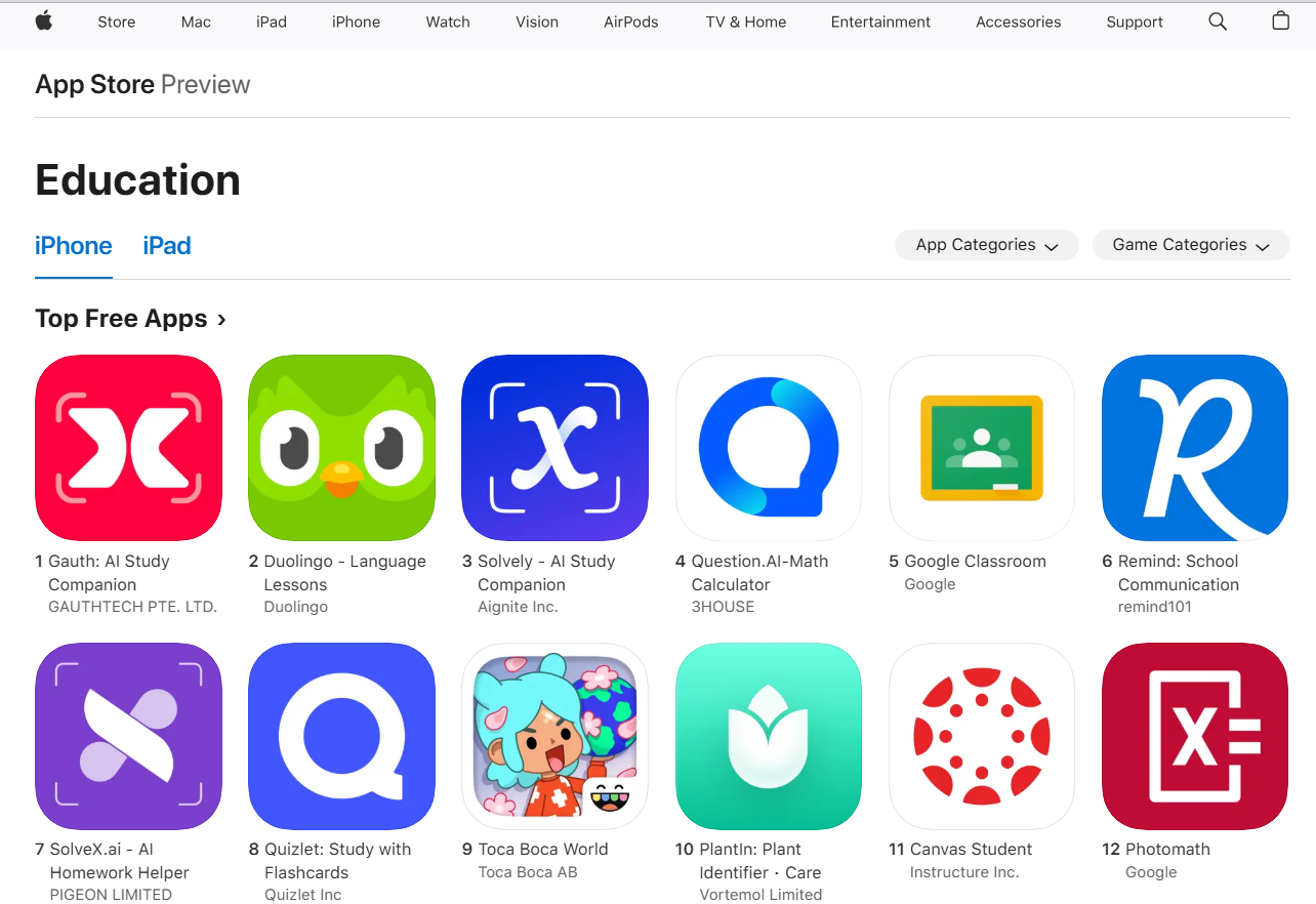 針對海外市場,作業幫此前推出的海外AI應用產品Question.AI,在北美、東南亞等地迅速適應并滿足了用戶的需求。美國蘋果 App Store教育排行榜顯示,Question.AI的下載量已經連續一年穩居前五之列,Question.AI在谷歌Play Store也同樣位居前列。