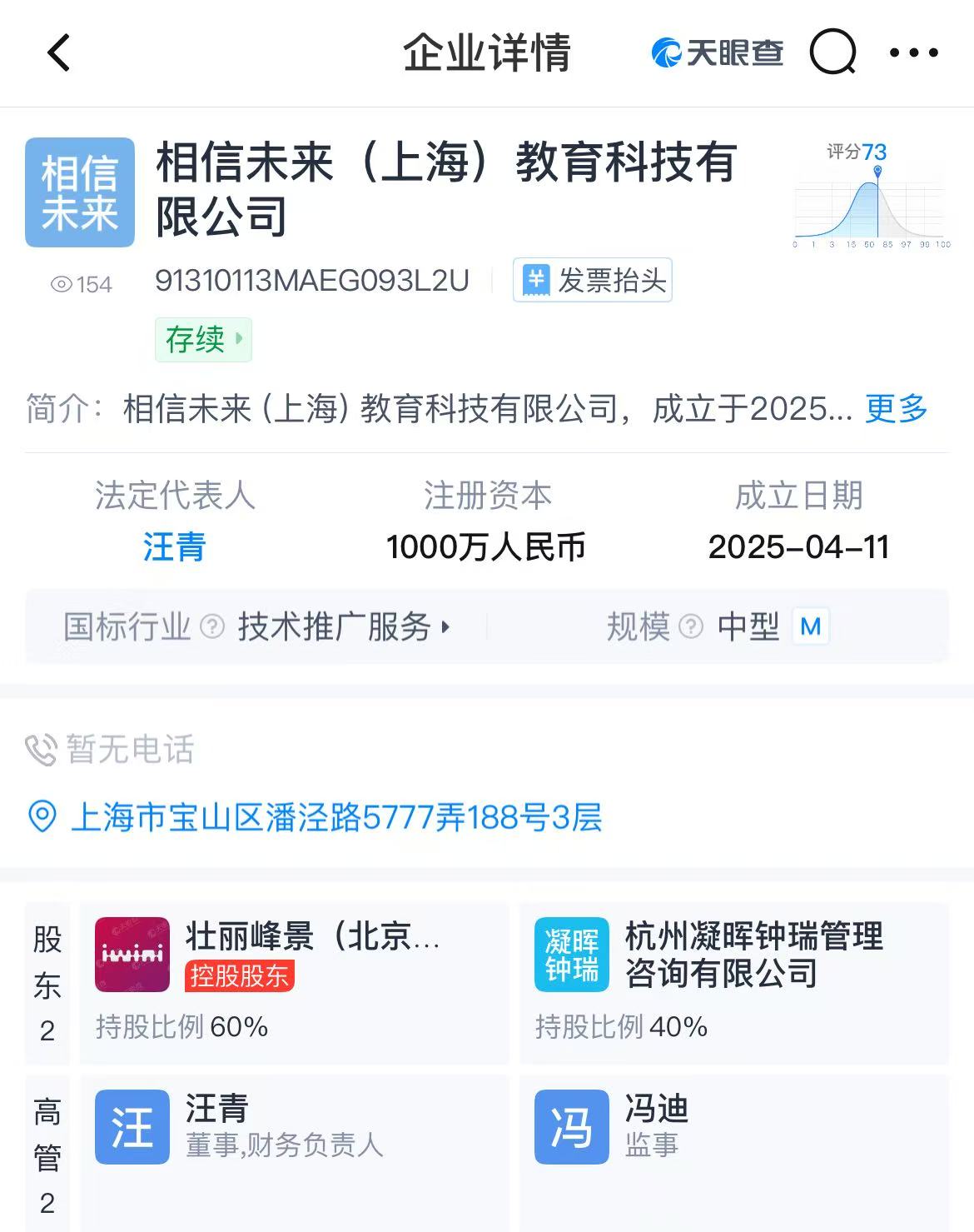 4月19日消息,天眼查顯示,近日,相信未來(上海)教育科技有限公司成立,法定代表人為汪青,注冊資本1000萬人民幣,經營范圍包括教育咨詢服務、軟件開發、計算機系統服務、軟件外包服務、信息系統運行維護服務、互聯網數據服務等。