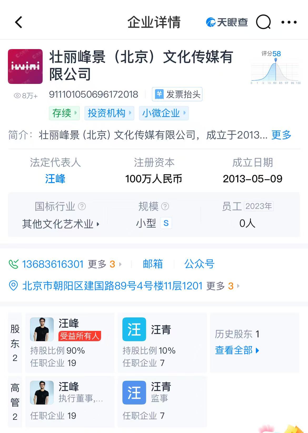 股東信息顯示,該公司由壯麗峰景(北京)文化傳媒有限公司、杭州凝暉鐘瑞管理咨詢有限公司分別持股60%、40%。最終受益人信息顯示,該公司實際控制人為汪峰。
