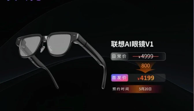 聯想 AI 眼鏡 V1 首發定價為 4199 元,將于 5 月 20 日在聯想官方商城正式開啟預約通道。