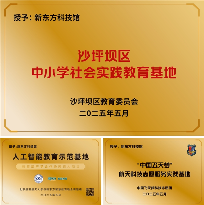 啟幕活動授牌儀式環節,新東方科技館被沙坪壩區教育委員會、北京航空航天大學與新東方智慧教育聯合課題組、中國飛天夢科技志愿團分別授予《沙坪壩區中小學社會實踐教育基地》《人工智能教育示范基地》《“中國飛天夢“ 航天科技志愿服務實踐基地》稱號。活動尾聲的啟動儀式環節,全體領導嘉賓一同上臺為新東方科技館開館按下啟幕鍵。
