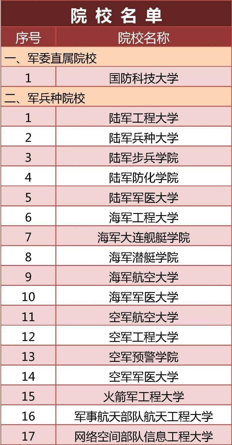 今年,共有22所軍隊高等教育院校面向普通高中畢業生招生。其中,軍委直屬院校1所,軍兵種院校19所,武警部隊院校2所。